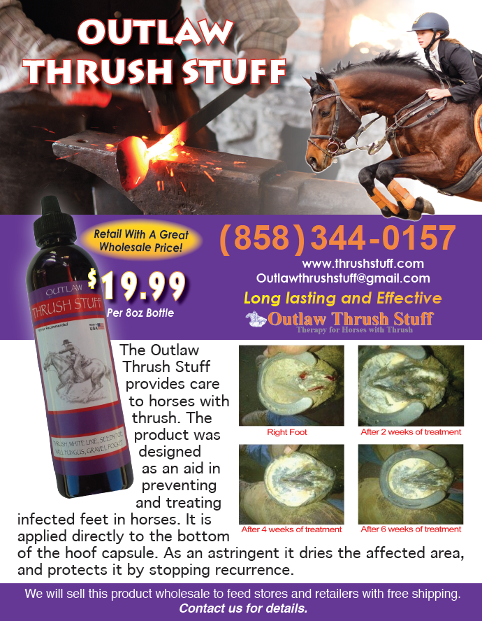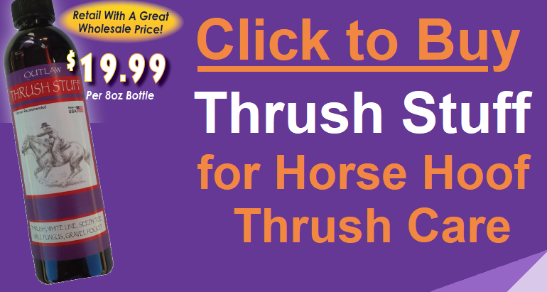 Thrush is treated by trimming back the old dead tissue and then treating the area with a solution that is an antiseptic and an astringent to treat infections of the hoof – which our product Outlaw Thrush Stuff does.