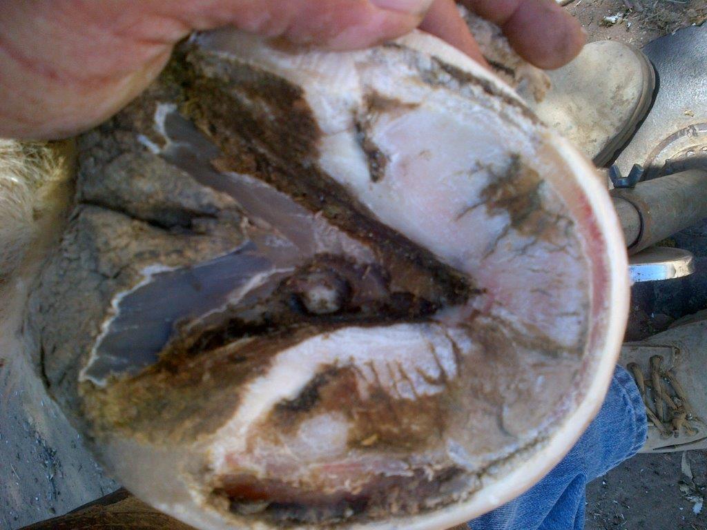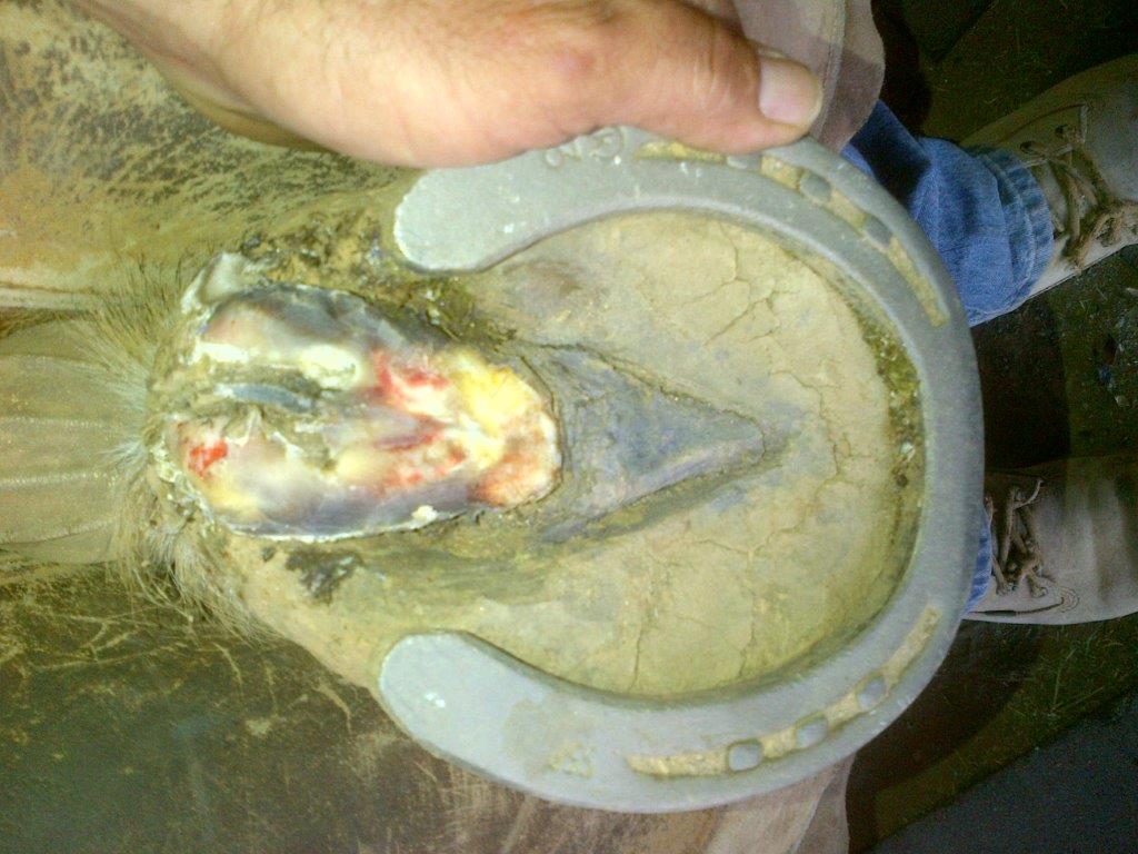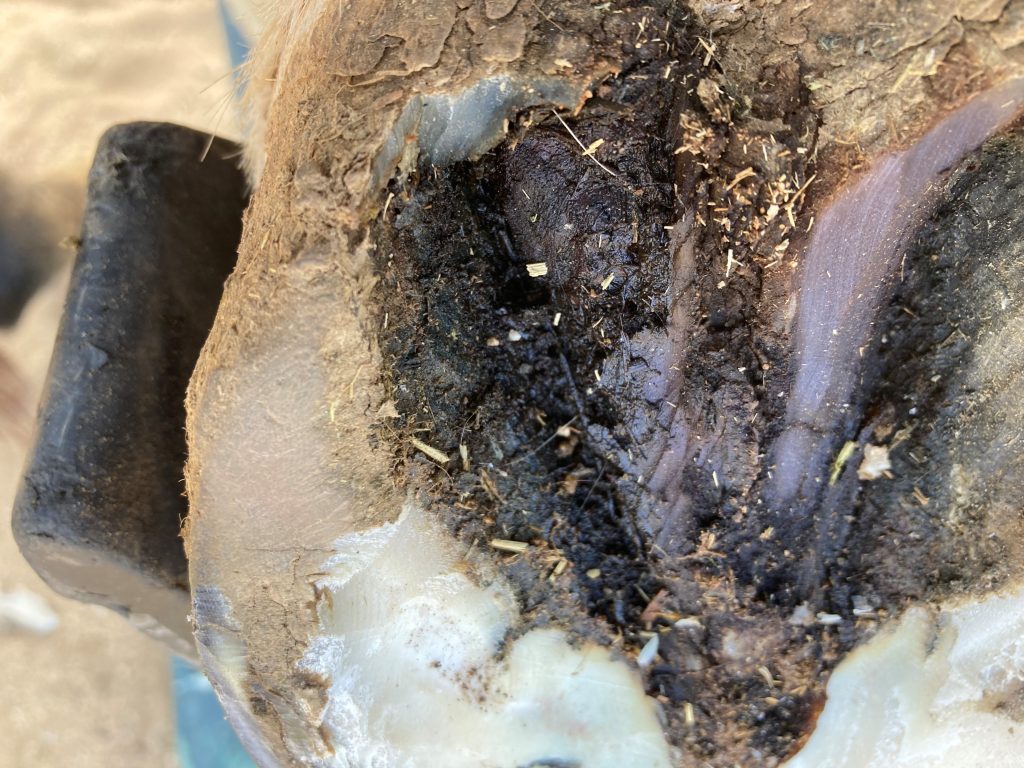 In severe cases, the thrush bacteria can reach the frog’s inner tissue, which is the sensitive tissue beneath the frog, causing pain and lameness for the horse. You may even notice blood on the end of the hoof pick when cleaning the frog. This picture is a close-up of the horse’s frog to show the thrush infection areas that need to thrush specific topical treatment.