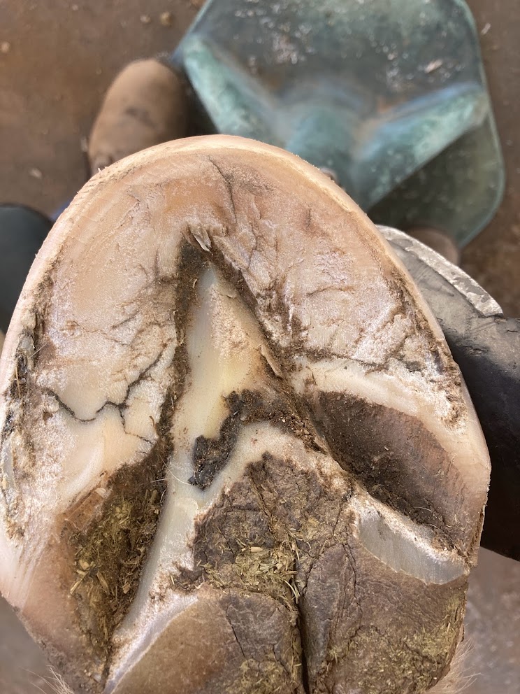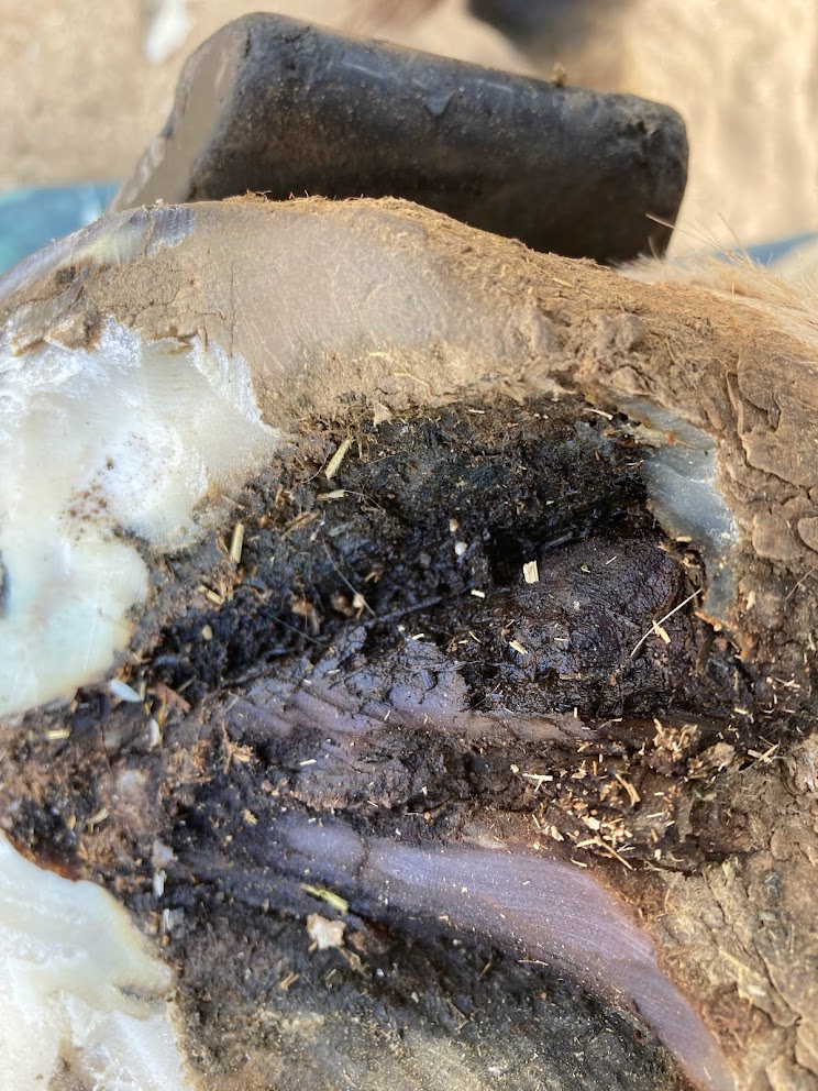 This picture is a close-up of the horse’s frog to show the thrush infection areas that need to thrush specific topical treatment.