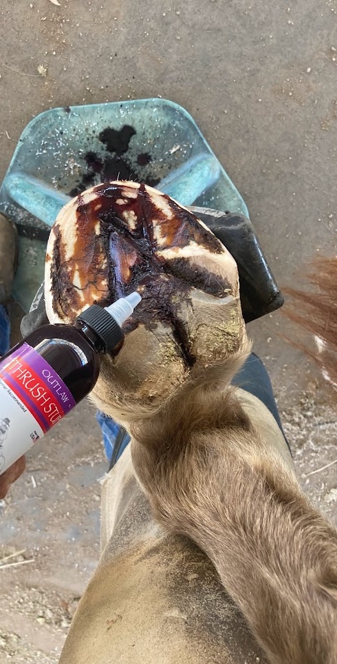 The hole caused by the thrush infection was 1/2″ deep before treatment. After three days of Outlaw Thrush Stuff treatment topical application, there was a considerable reduction in both the size and depth of the horse’s thrush infection—no sting formula. After a few weeks, the farrier will trim the thrush hole; you would never know it was there.