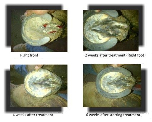 Below is an example of treating a horse with severe thrush for horses. The right front hoof is infected with thrush, and the frog is cracking and cut. Next, you see two weeks after using the Outlaw Thrush Stuff product how much better the frog is looking, the cuts have healed, and the horse frog is still swollen but much better than before. Then you can see four weeks after treatment for thrush where the frog is in better shape, and six weeks after treatment.