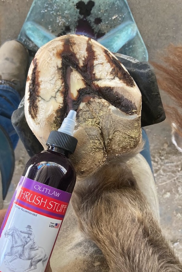 A more robust treatment to effectively treat this condition in the hoof is needed. The recommended product Outlaw Thrush Stuff is an effective treatment because it’s antiseptic and astringent. As an antiseptic, it kills the thrush deep in the hoof’s nooks and crevices where the thrush grows.