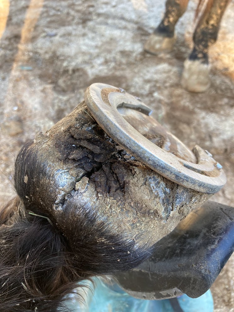 The frogs should be trimmed so that while the V of the frog may remain somewhat deep, the frog isn’t allowed to grow to a point where it is overlapping, trapping organisms that can grow. This promotes self-cleaning of the clefts during a horse’s outside activities, including walking, exercising, playing, working, etc.